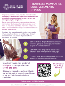 Cette affiche bilingue de 21,6 cm x 27,9 cm vous aide à promouvoir notre atelier sur les soutiens-gorge et les prothèses dans votre clinique. Elle fournit une brève description de notre atelier sur les soutiens-gorge et les prothèses, ainsi qu’un code QR pour s’inscrire. Des dépliants imprimés (10,2 cm x 22,9 cm) disponibles. Commandez ici.