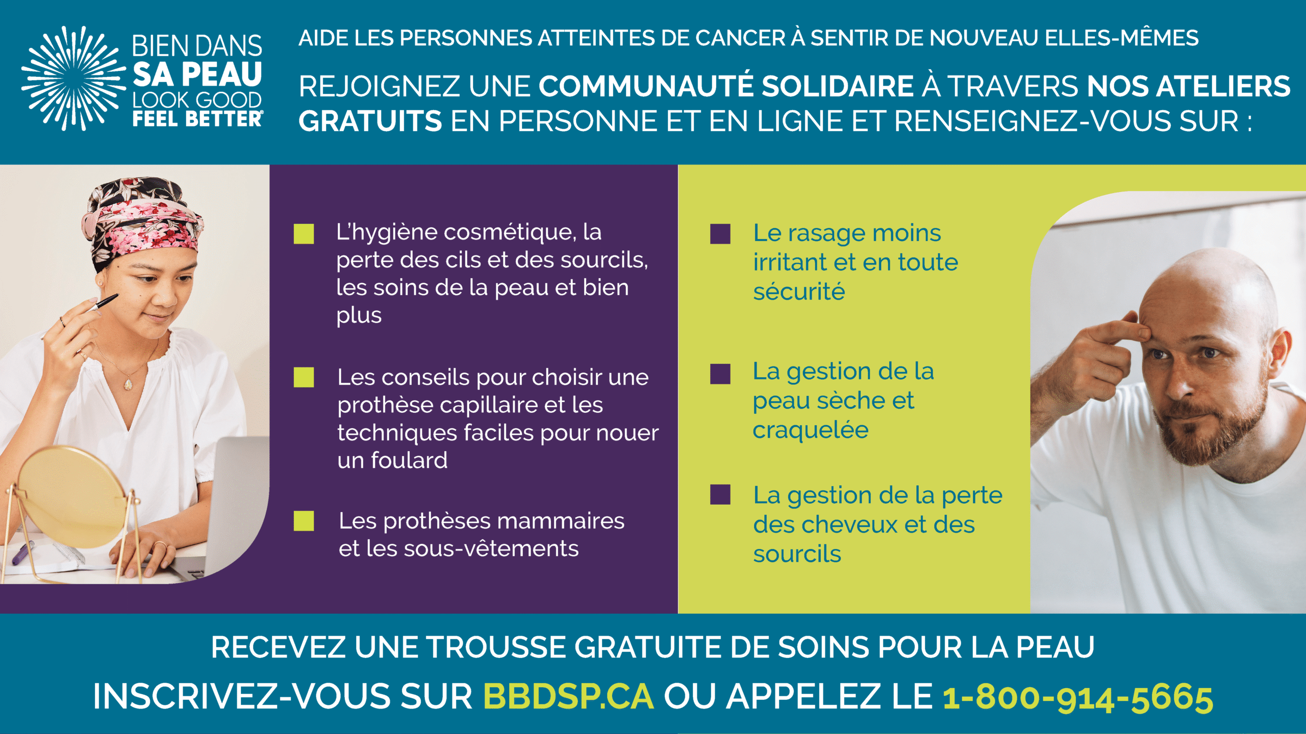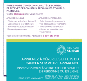 Ressources électroniques et imprimées conçues pour vous aider à fournir facilement et efficacement les informations nécessaires à vos patients afin qu'ils puissent bénéficier des ateliers en ligne et en personne Belle et bien dans sa peau et des ressources relatives aux effets secondaires.
